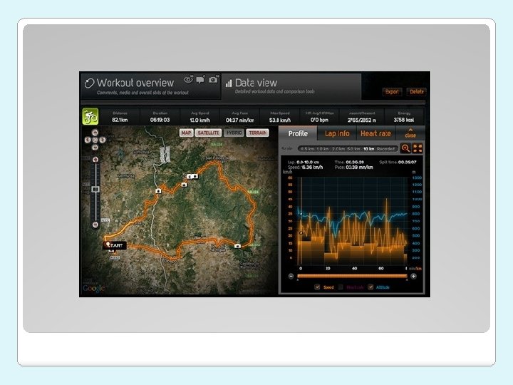 Principais funcionalidades �Registo, monitorização e análise de performances; �Permite saber quantas calorias gastamos num determinado exercício; �Mapas, registo do tempo (registo da velocidade média), registo da distância; �Partilha do exercício nas mais diversas redes sociais, como por exemplo o Facebook e Twitter; �Possibilidade de partilha de trilhos; �Multiplataforma.