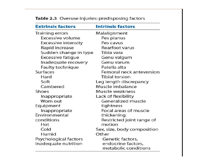 Types of Injuries • Acute injuries may be due to extrinsic causes, such as a direct blow, either as a result of contact with another player or equipment, or intrinsic causes, such as a ligament sprain or muscle tear. acute injuries may be classifi ed according to the particular site injured (e. g. bone, cartilage, joint, ligament, muscle, tendon, bursa, nerve or skin) and the type of injury (e. g. fracture, dislocation, sprain or strain). • Overuse injuries present three distinct challenges to the clinician— diagnosis, treatment and an under- standing of why the injury occurred. Diagnosis requires taking a comprehensive history of the onset, nature and site of the pain along with a thorough assessment of potential risk factors, for example, training and technique.