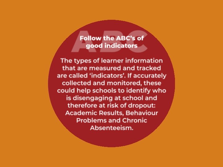 BUILDING A RESILIENT EDUCATION SYSTEM Learner-level data tracking • Research shows that one of the best ways to prevent dropout is through effective monitoring systems • These systems must track learner progress to alert education officials when learners are at risk • What should we be tracking? ABC’s*… • Academic results • Behaviour problems • Chronic Absenteeism * Findings based on international best practice and research on learner disengagement and dropout. (UNESCO Monitoring Education Participation Series)