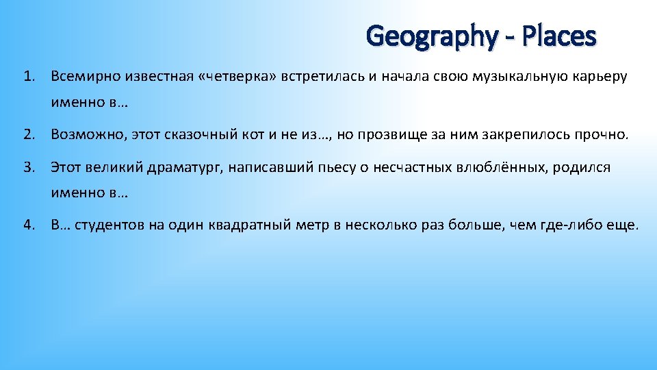 1. What is the biggest city of England? 2. What is the national flag of England? 3. What is the national flower of England? 4. What is the national animal of England? 5. What is English traditional food number 1? 6. What is the most popular sport in England? 7. What is the most popular music band in England? 8. How many people live in England? 9. How many languages can we hear in London? 10. What is the name of the most famous clock- tower in London? 11. What is the name of traditional English drink? 12. What language was official in England in 1066?
