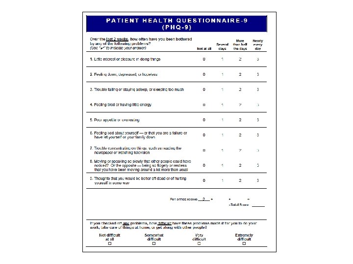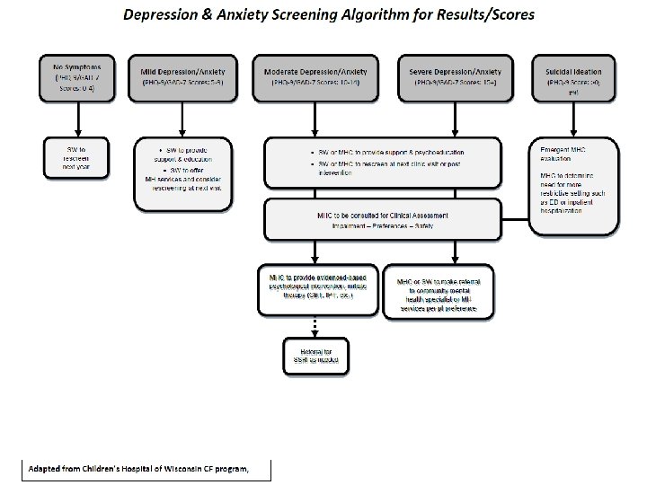 CFF and ECFS International Committee on Mental Health in CF (ICMH) Guidelines • Prevention: – Ongoing education & preventative, supportive interventions – Behavioral approaches be used to reduce the risk of distress • Screening – Annual screening for adolescents and adults with CF (ages 12–adulthood) with PHQ-9 and GAD-7 – Annual screening of caregivers of children and adolescents – Screening of children (<12) if one caregiver is depressed or there is concern Quittner A et al, Thorax 2015