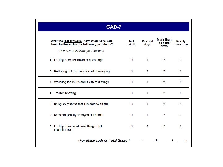 GAD Adjustment do w/ anxious mood PTSD Excessive anxiety and worry x 6 months about few things Associated with 3+: Restlessness Panic Easily fatigued Disorder Diff concentrating Irritability Muscle tension Sleep disturbance Impairment Phobias Not due to effects of substance or illness Anxiety OCD American Psychiatric Association, 2013, DSM 5 Medical Conditions: Hypoxia Metabolic Infection Tumor Medications: Steroids Albuterol Thyroid meds Stimulants Theophylline