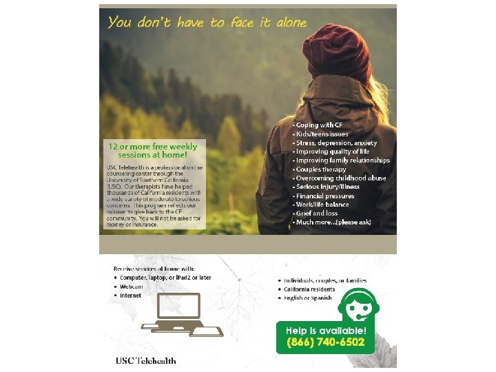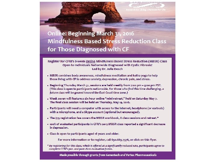 Bridging the Mental Health Gap Access to MH services now • • • MH screening, referral MH system broken Medi-Cal, GHPP Private insurance Patients – Depression as barrier – CF as barrier • Providers – Expensive – Don’t take insurance Improvements with MHC • Services embedded in CF clinic • Evidenced based interventions in your clinic appointment * • Access to medications • Increased focus on MH • Improved data tracking for research and QI • Psychiatrist with CF expertise