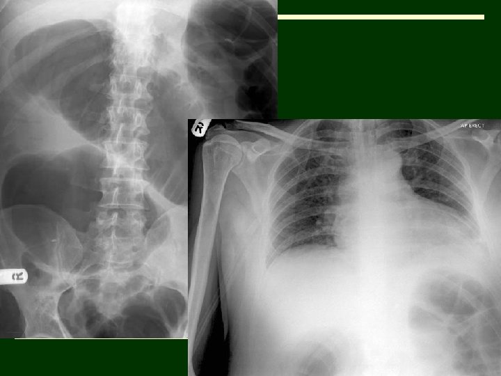 Discussion o Acute colonic pseudo-obstruction or Ogilvie syndrome is a condition with clinical and radiological features of colonic obstruction without any evidence of a mechanical cause. o Abdominal distension in this patient accounted for the respiratory distress and the dilated large bowel loops seen on the chest radiographs guided towards the correct diagnosis. o Pathophysiology is not clearly understood, though it is thought to be due to an imbalance in the autonomic innervation leading to a functional bowel obstruction. o Ogilvie syndrome typically occurs in patients hospitalized with a significant illness e. g. severe cardio-respiratory disorders, sepsis, electrolyte imbalance and postoperatively. o Left untreated it can progress to colonic perforation and peritonitis. Plain abdominal film is the initial imaging investigation of choice. Colonoscopy can be both diagnostic and therapeutic