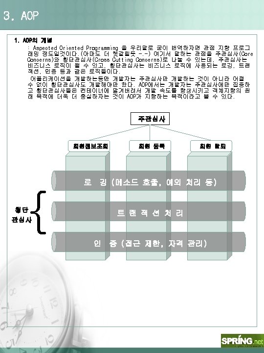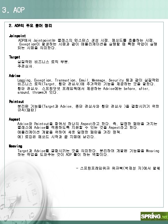 3. AOP 4. Aspect 설정 방법 <objects xmlns='http: //www. springframework. net'> <object id="before. Advice" type="My. Spring. Sample_AOP. Aspect. Object. Before. Log, My. Spring. Sample_AOP" /> <object id="after. Advice" type="My. Spring. Sample_AOP. Aspect. Object. After. Log, My. Spring. Sample_AOP" /> <object id="around. Advice" type="My. Spring. Sample_AOP. Aspect. Object. Around. Log, My. Spring. Sample_AOP" /> <object id="throws. Advice" type="My. Spring. Sample_AOP. Aspect. Object. Exception. Log, My. Spring. Sample_AOP" /> <object id="DAOproxy" type="Spring. Aop. Framework. Proxy. Factory. Object"> <property name="Target"> <object type="My. Spring. Sample_AOP. DAO, My. Spring. Sample_AOP" /> </property> <property name="Interceptor. Names"> <list> <value>before. Advice</value> <value>after. Advice</value> <value>around. Advice</value> <value>throws. Advice</value> </list> </property> </objects> : Aspect를 설정하는 방법은 위에서 보듯이 Advice들을 구현한 object를 선언한 후에 타겟 객체를 지정하면 해당 객체의 메소드가 실행될 때 “interceptor. Names”Property의 “list”엘리먼트에서 지정한 Advice들이 해당 메소드의 실행을 가로채게 된다. 즉, 위에서는 DAO 객체의 메소드가 실행될 때 Advice가 작동하게 되는것이다.