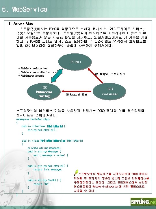 5. Web. Service 2. Client Side : 클라이언트에서는 PONO 모듈을 참조한 후에 설정 파일에서 해당 웹서비스를 사 용하겠다는 선언을 하면된다. <object id="hello. World. Service" type="Spring. Web. Services. Web. Service. Proxy. Factory, Spring. Services"> <property name="Service. Uri" value="http: //localhost/Hello. World. Web/helloworldservice. asmx"/> <property name="Service. Interface" value="Hello. World. App. IHello. World, Hello. World. App"/> <property name="Product. Template"> <object> <property name="Timeout" value="10000" /> 웹메소드를 호출후 기다리는 시간 10초 설정 </object> </property> </object> 설정 파일에서는 위의 설정만으로 충분하며 클라이언트 코드에서는 일반적인 DI 기능을 사용하듯이 사용하면 된다. private IHello. World service. Hello; public IHello. World Service. Hello { get { return service. Hello; } set { service. Hello = value; } } private void button 1_Click(object sender, Event. Args e) { string s = Service. Hello. World(); Message. Box. Show(s); }