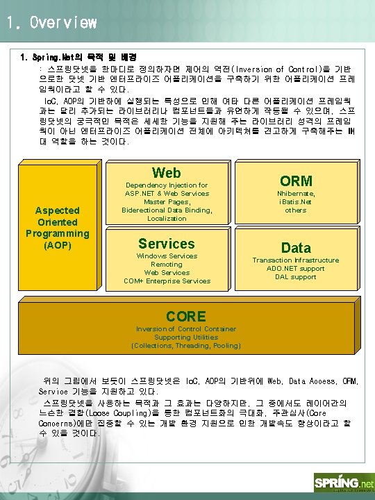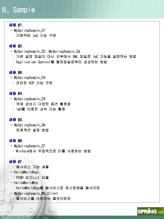 목 차 1 Overview 2 Inversion of Control 3 AOP 4 Data Access 5 Web Service 6 Sample