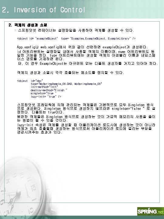 2. Inversion of Control 3. Dependency Injection : 스프링닷넷 프레임웍은 설정 파일 내에서 객체간의 의존 관계를 설정할 수 있다. 이는 디자인패턴의 Factory Method Pattern에서의 팩토리 클래스와 같은 효과를 가진다. <object id=“service” type=“Service. Layer. Service, Service. Layer”> <property id=“Dao” ref=“dao”/> </object> <object id=“dao” type=“Dao. Layer. DAO, Dao. Layer”> 위의 설정은 Service 클래스에서 Property 메소드를 사용해서 DAO 클래스의 인스 턴스를 획득하고 있다. //Service. cs public class Service : IService { private IDAO dao; public IDAO Dao { set { dao = value; } } public string Say. Hello(string name) { return dao. Hello. DAO(name + " " + Test. Value); } } //DAO. cs public class DAO : IDAO { public string Hello. DAO(string name) { return "HELLO " + name + " FROM DAO"; } } 단, Property를 이용하여 DI를 구현할 경우에는 사용하는 클래스의 디폴트 생성자( 아규먼트없는 public 생성자)를 가지고 있어야 하며, 부득이하게 private 으로 선 언하여야 할 경우에는 다음으로 소개할 <constructor-arg> 엘리먼트를 사용하여야 한다. <object id=“service” type=“Service. Layer. Service, Service. Layer”> < constructor-arg name=“Dao” ref=“dao”/> </object>