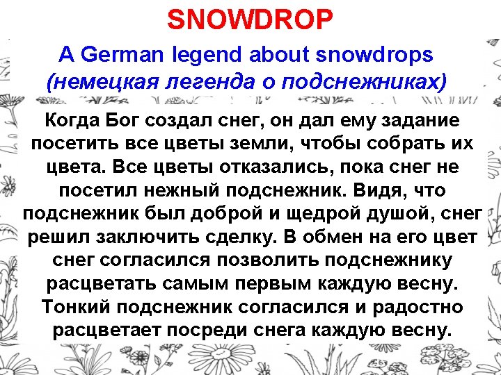 SPRING FLOWERS 5. What spring flower means purity (чистота)? a. cornflower b. snowdrop c. bluebell d. buttercup snowdrop подснежник