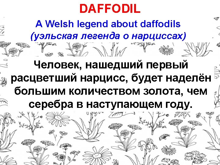 SPRING FLOWERS 6. There is a Welsh legend about this spring flower that says that a person who will find its first bloom will get more gold than silver in the upcoming year. a. cornflower b. daffodil c. bluebell d. buttercup daffodil нарцисс
