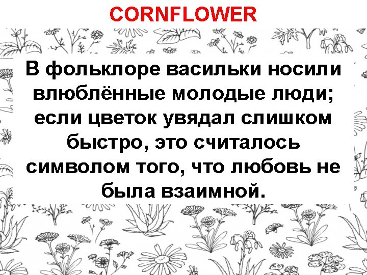 SPRING FLOWERS 7. Young men in love wore these spring flowers and if the flower faded too quickly, it was taken as a sign that the man's love was not returned. a. cornflower b. snowdrop c. bluebell d. buttercup cornflower василёк