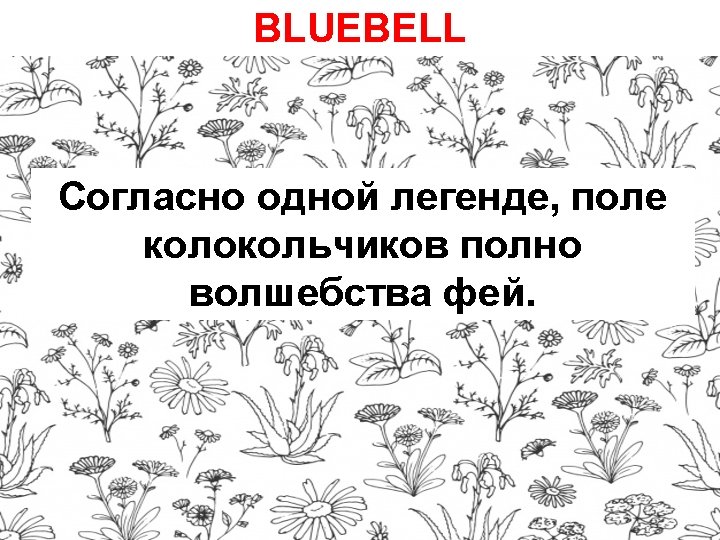 SPRING FLOWERS • Humility mid-April – late May (смирение) • Gratitude (благодарность) • Constancy (постоянство, верность) bluebell [‘blu: bel] колокольчик • Everlasting love (вечная любовь)