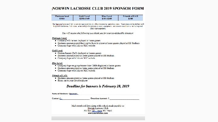 We Need Corporate Sponsorships Who: What: Why: LAX Parents who own businesses All Community businesses Tax deductible donations To cover our increasing operating costs Forms are on the tables and on the website
