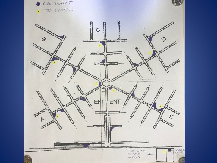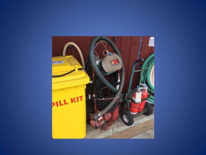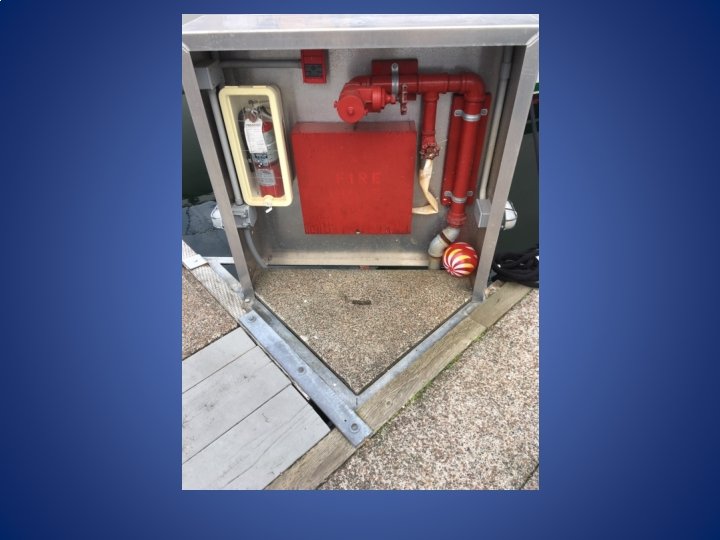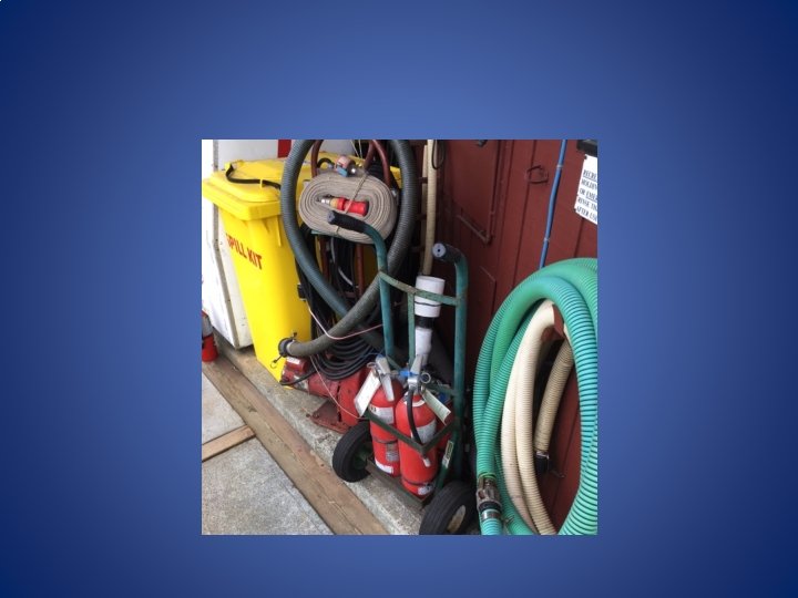 • Simple checklist at each hub hose station • Portable pump and extinguishers – Portable pump is 230 V and only plugs into certain outlets in the marina – Look for Green Taped Covered Electrical outlets halfway out each float • Enough extension cord to reach anywhere on the float or between floats
