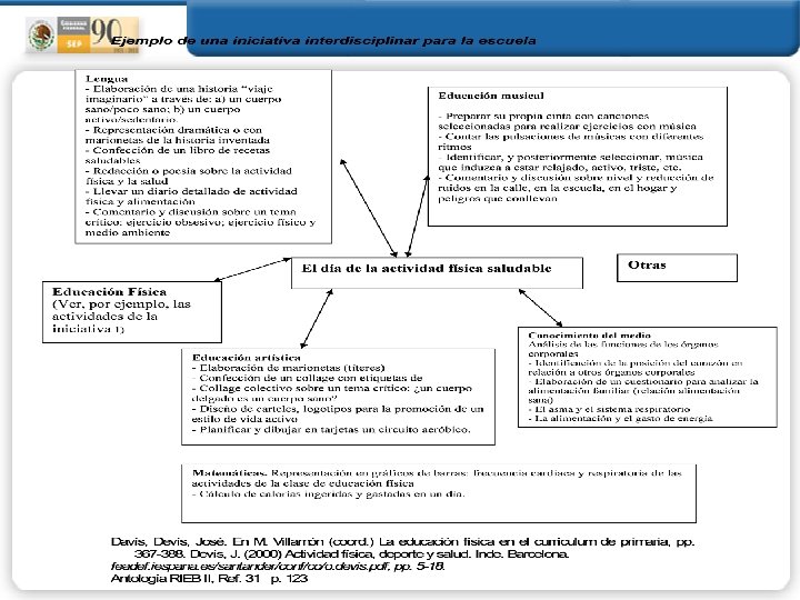 Continua actividad 7. 1 • Realice la lectura: “Incorporar temas de relevancia social” y destaque lo más importante. • Continuando el trabajo por parejas, apoyados en su experiencia y las lecturas anteriores, identifiquen un tema de relevancia social que consideren prioritario por la problemática del contexto escolar en donde se desempeñan. • Con la finalidad de favorecer el tratamiento del tema de manera articulada analicen la siguiente propuesta de Devís sobre un proyecto interdisciplinar de salud que se encuentra en la siguiente diapositiva. Nota: Pueden apoyar la elección del tema de relevancia social retomando los textos sobre educación y salud en la escuela, proyectos de estilos de vida saludable, alimentación, diversidad e interculturalidad, educación para la paz y equidad de género, que se encuentran en las referencias 25, 27, 29 y 34 a 41 de la Antología del curso RIEB II.