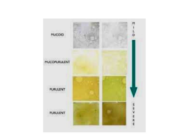 Appearance • Purulent: Green Looking, mostly pus • Mucopurulent: Green Looking with pus & mucus. • Mucoid: Mostly mucus • Mucoslivary: