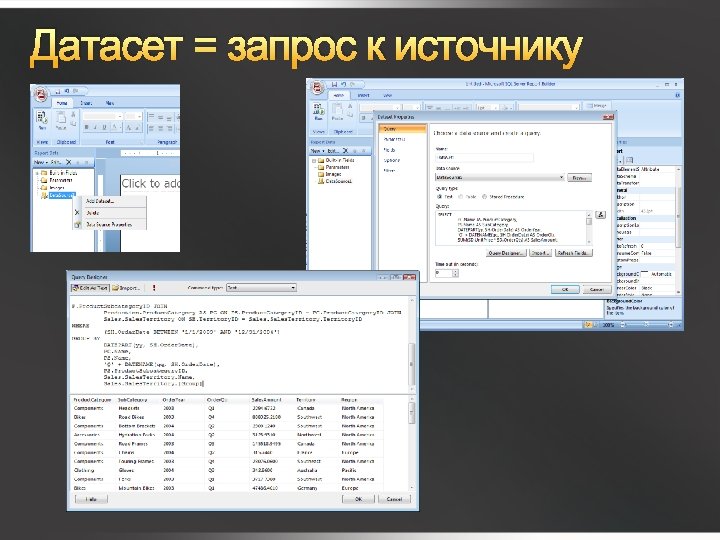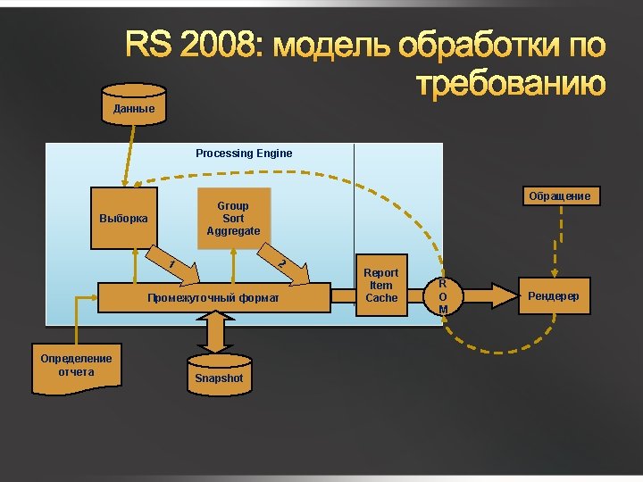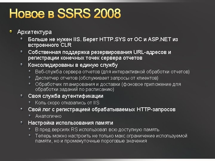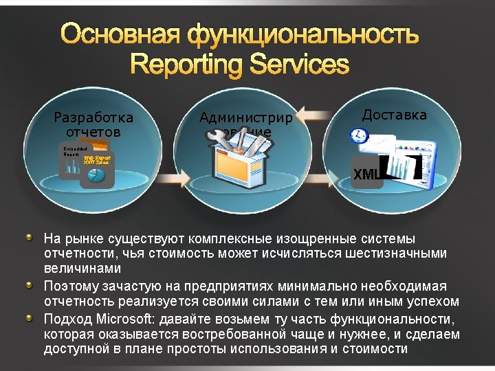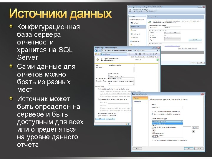 Компоненты SSRS 2008 Report Builder Report Designer Management Studio Share. Point V 3 3 rd Party Report Processing Applications Configuration Tool Scheduling & Delivery Web Service Extensibility Report Manager Database Maintenance Background Processing WMI Report Data Sources Platform WMI Provider Report Server Database Share. Point V 3 Databases Configuration Files