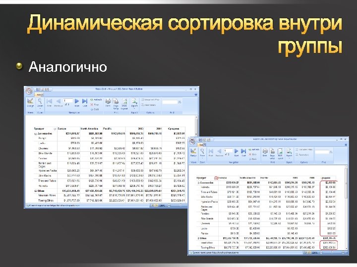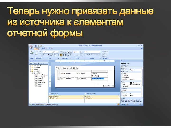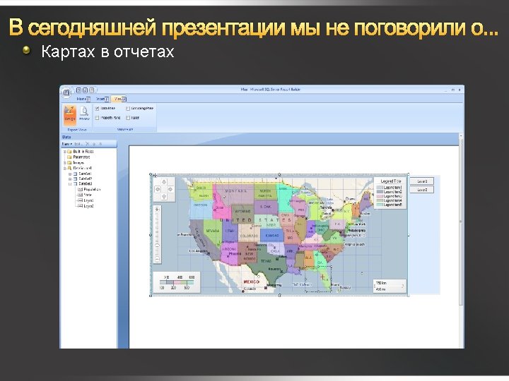 Средства разработки отчетов Шаблон Report Designer в Visual Studio Ставится в составе клиентской части SQL Server Report Builder 2. 0 http: //www. microsoft. com/downlo ads/details. aspx? Family. ID=9 f 783 224 -9871 -4 eea-b 1 d 5 f 3140 a 253 db 6&Display. Lang=en Notepad Имеется в виду, что определение отчета хранится в виде XML и его можно редактировать руками Описание схемы RDL - http: //download. microsoft. com/do wnload/6/5/7/6575 f 1 c 8 -460748 d 2 -941 dc 69622 e 11 c 32/RDL_spec_08. pdf