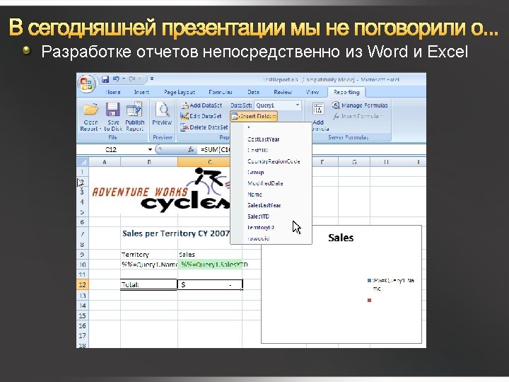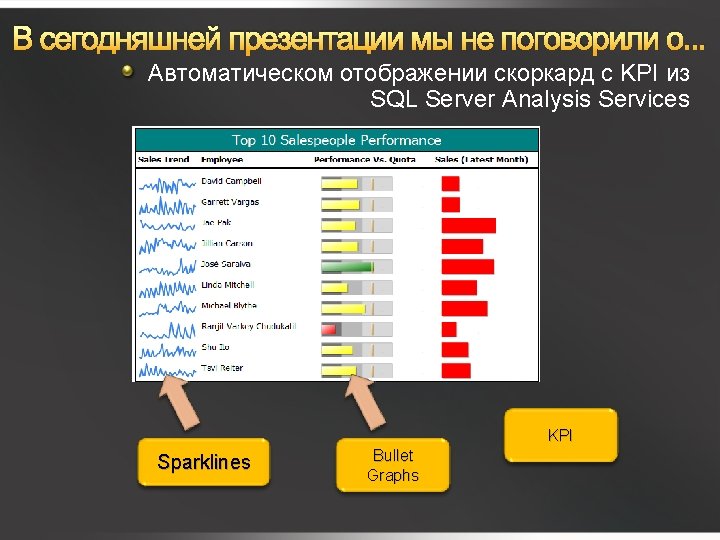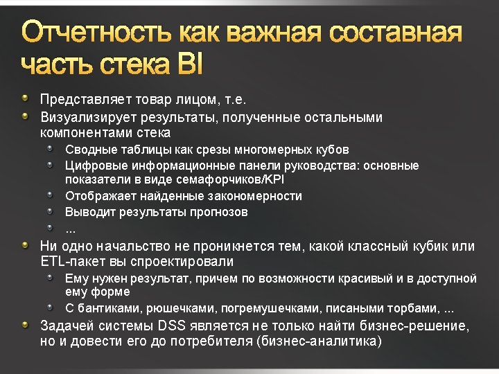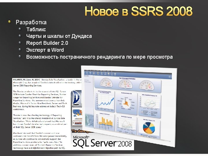 SQL Server: комплексное предложение в области BI Доставка Share. Point® Server Отчеты Excel Dashboards Workbooks Analytic Views Scorecards Планир ование Средства конечного пользователя Excel ® Performance. Point Services™ Microsoft SQL Server Reporting Services SQL Server Analysis Services SQL Server DBMS SQL Server Integration Services Oracle SAP Siebel . . .
