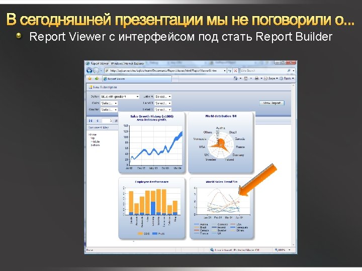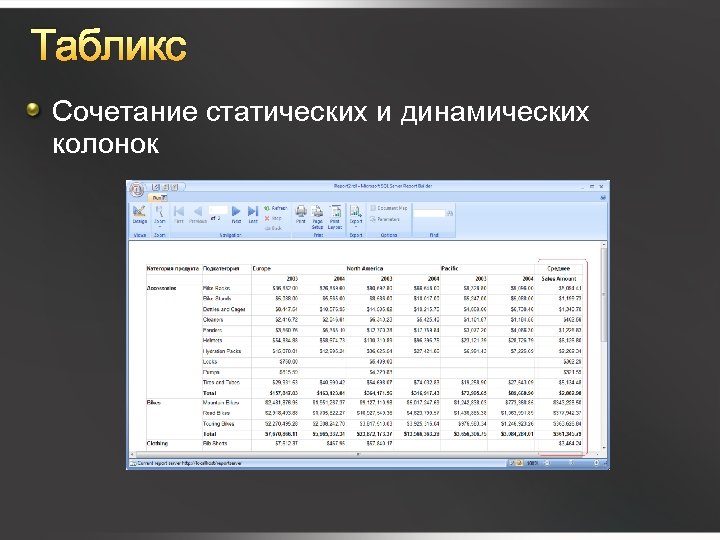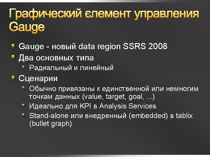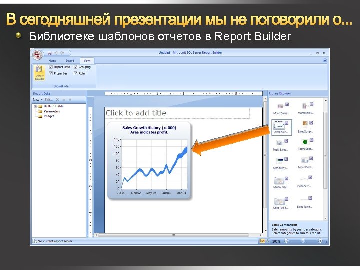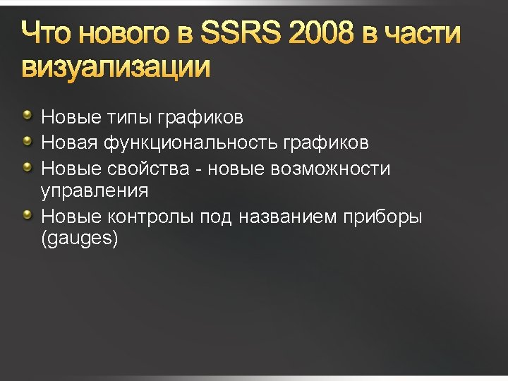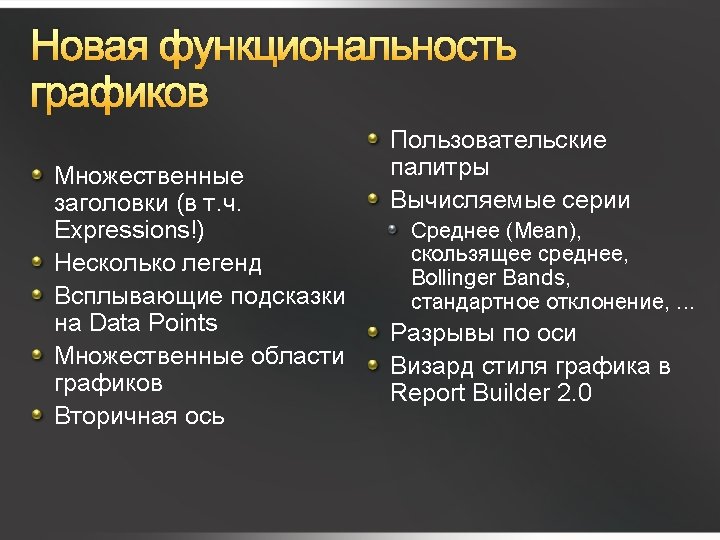 Типы графиков в SSRS 2008 Column (3 -D), Stacked (3 -D), 100% Stacked (3 -D), Clustered (3 -D), Cylinder (3 -D) , Stacked Cylinder (3 -D), 100% Stacked Cylinder (3 -D), Clustered Cylinder (3 -D) Line (3 -D), Smooth Line, Stepped Line, Smooth Line, Stepped Line with Markers, Smooth Line with Markers Shape Pie (3 -D), Exploded Pie (3 -D), Doughnut, Exploded Doughnut, Funnel (3 -D), Pyramid (3 -D) Area (3 -D), Smooth Area (3 -D), Stacked, Smooth Area (3 -D) 100% Stacked (3 -D) Новое в SQL Server Reporting Services 2008 Range Smooth, Range Column, Range Bar, Stock, Candlestick, Error Bar, Boxplot Bar, Stacked (3 -D), 100% Stacked (3 -D), Clustered (3 -D) Stacked Horizontal Cylinder (3 -D), Stacked 100% Horizontal Cylinder (3 -D), Clustered Horizontal Cylinder (3 -D) Scatter Bubble Polar, Radar (3 -D) Pareto Histograms