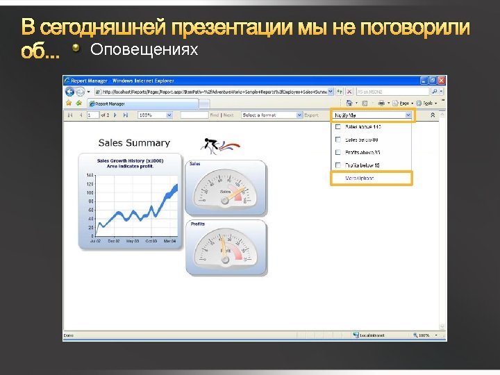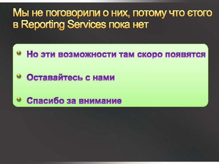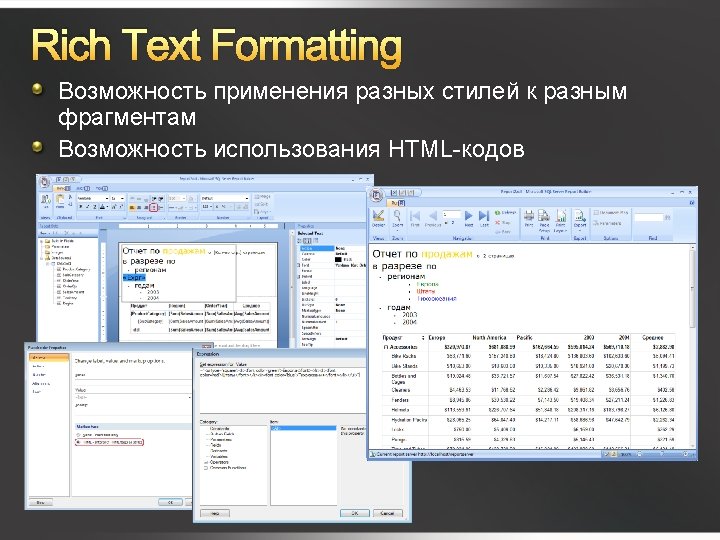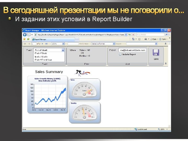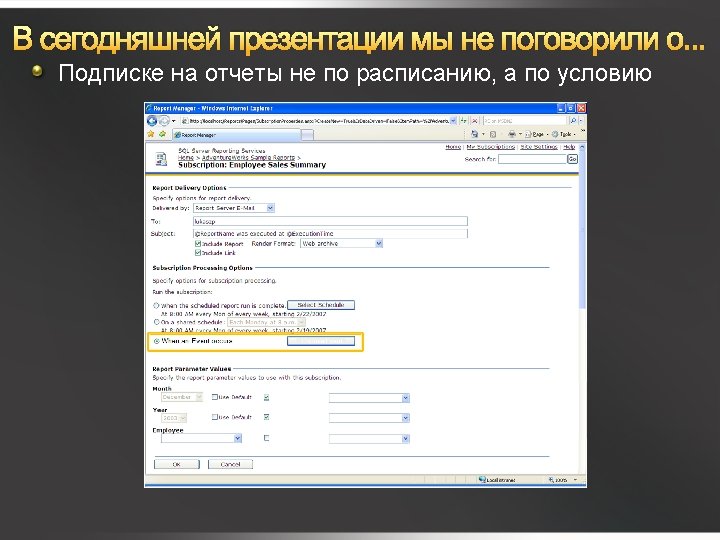 Microsoft SQL Server Reporting Services Вышли между SQL Server 2000 и 2005 27 января был 5 -летний юбилей http: //www. microsoft. com/presspass /press/2003/dec 03/1217 sqlbihonorspr. mspx http: //www. microsoft. com/presspass /features/2004/jan 04/0127 sqlreporting. mspx В настоящий момент входят в состав большинства редакций SQL Server 2008, включая Express with Advanced Services http: //www. microsoft. com/downloads/details. aspx? Family. Id=B 5 D 1 B 8 C 3 -FDA 5 -4508 -B 0 D 0 -1311 D 670 E 336&displaylang=en Т. е. раздаются нахаляву