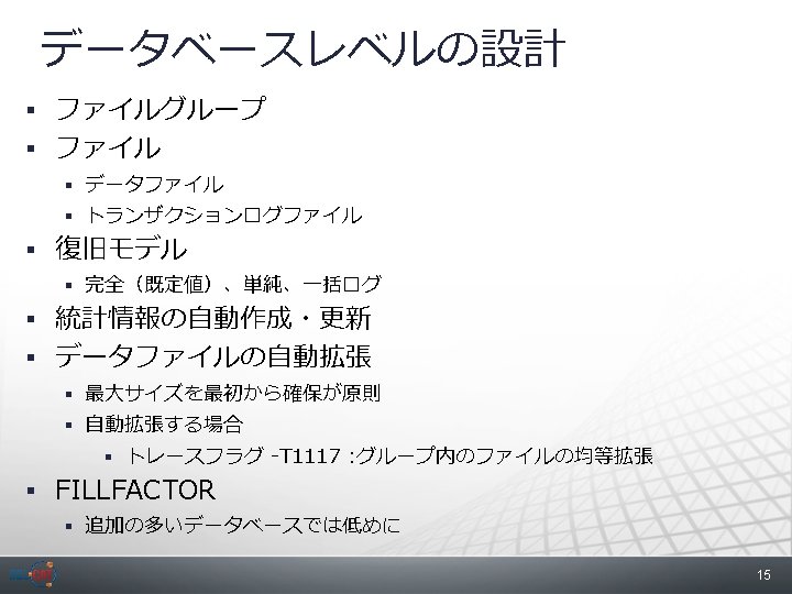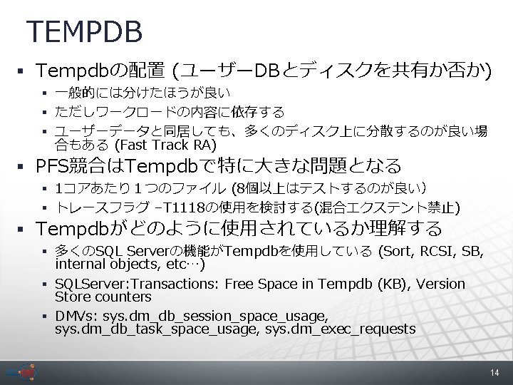 インスタンスレベルの設計(2) § プロセッサ § ALTER SERVER CONFIGURATION SET PROCESS AFFINITY § X Boost SQL Server priority § X User Windows fibers § セキュリティ § 認証モード § C 2監査 § リモートDAC § EXEC sp_configure 'show advanced option', 1 § EXEC sp_configure 'remote admin connections', 1 § ユーザーデータベース § Tempdb 13