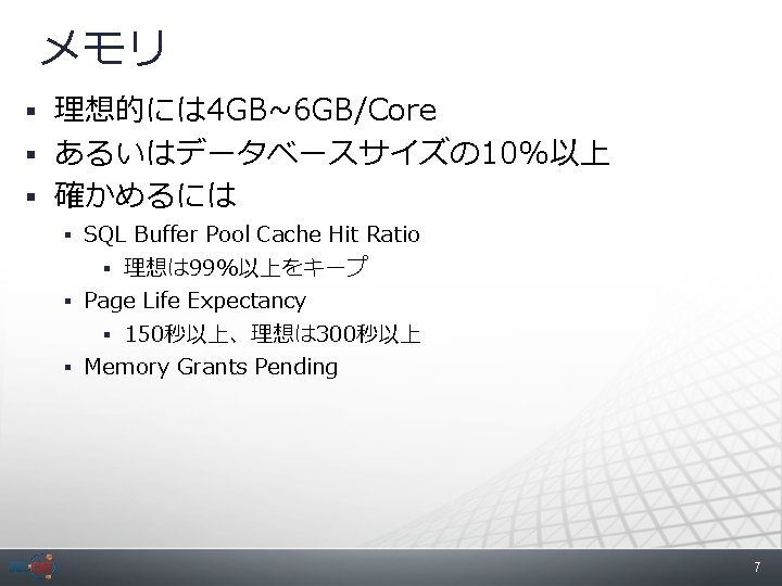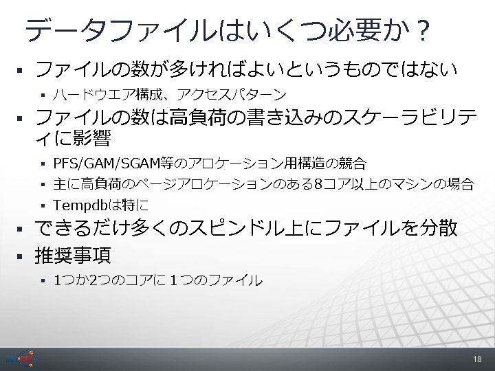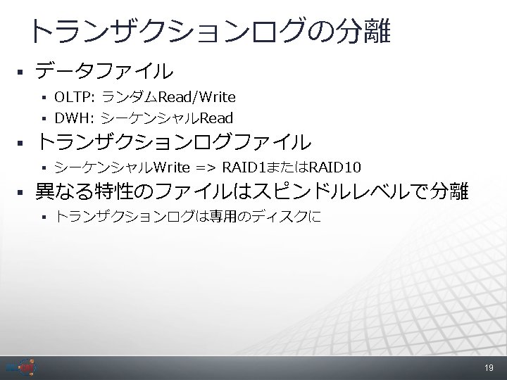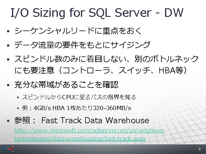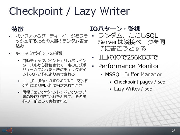 SQL Server I/O パターン § SQL Serverの主な機能のI/O特性を理解すること はストレージの設計に役立ちます Operation Random / Sequential Read / Write Size Range OLTP – Log Sequential Write Up to 60 K OLTP – Data (Index Seeks) Random Read 8 K OLTP - Lazy Writer Random Write Any multiple of 8 K up to 256 K OLTP - Checkpoint Random Write Any multiple of 8 K up to 256 K Read Ahead (DSS, Index/Table Scans) Sequential Read Any multiple of 8 KB up to 512 K Bulk Insert Sequential Write Any multiple of 8 K up to 256 K BACKUP / Restore Sequential Read/Write Multiple of 64 K (up to 4 MB) DBCC – CHECKDB Sequential Read 8 K – 64 K ALTER INDEX REBUILD (Read Phase) Sequential Read (see Read Ahead) ALTER INDEX REBUILD (Write Phase) Sequential Write Any multiple of 8 K up to 128 K 26