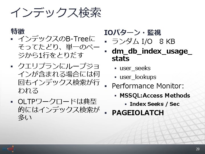 テーブル・範囲スキャン 特徴 § Query plans doing hash and merge joining § Aggregation Queries § Typical for DW workloads § SQL Server may perform read-ahead § Dynamically adjust size of I/O based on page continuity § Standard Edition: Up to 128 pages in queue § Enterprise Edition: Up to 512 pages in queue IOパターン・監視 § Sequential in nature I/O § Up to 512 KB Block Sizes § SQL Server Wait Stats § PAGEIOLATCH § dm_db_index_usage_st ats § user_scans § Performance Monitor: § MSSQL: Access Methods § Range Scans / Sec § Table Scans / Sec § MSSQL: Buffer Manager § Readahead Pages / sec 30