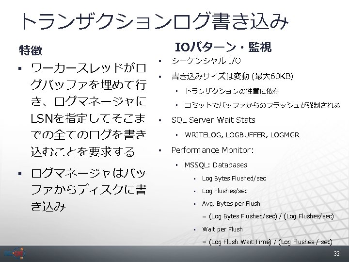 テーブル・範囲スキャン 特徴 IOパターン・監視 § クエリプランがハッシュジ § シーケンシャル I/O ョイン、マージジョイン § 最大 512 KB Block Sizes § SQL Server Wait Stats § 集計クエリ § PAGEIOLATCH § データウエアハウス系 § dm_db_index_usage_stats § リードアヘッド § user_scans § SQL Server may § Performance Monitor: perform read-ahead § ページの連続度に応じてI/O のサイズを変更 § MSSQL: Access Methods § Range Scans / Sec § Table Scans / Sec § MSSQL: Buffer Manager § Readahead Pages / sec 31