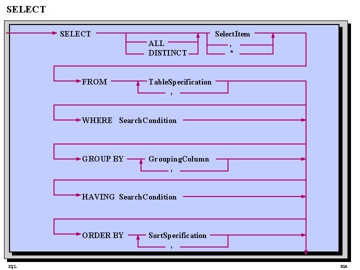 SELECT ALL DISTINCT FROM Select. Item , * Table. Specification , WHERE Search. Condition GROUP BY Grouping. Column , HAVING Search. Condition ORDER BY SQL Sort. Specification , Hi. A