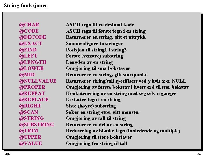 String funksjoner @CHAR @CODE @DECODE @EXACT @FIND @LEFT @LENGTH @LOWER @MID @NULLVALUE @PROPER @REPEAT @REPLACE @RIGHT @SCAN @STRING @SUBSTRING @TRIM @UPPER @VALUE SQL ASCII tegn til en desimal kode ASCII tegn til første tegn i en string Returnerer en string, gitt et uttrykk Sammenligner to stringer Posisjon til string 1 i string 2 Første (venstre) substring Lengden av en string Omgjøring til små bokstaver Returnerer en string, gitt startpunkt Returnerer string/tall spesifisert ved y hvis x er NULL Omgjøring av første bokstav i hvert ord til stor bokstav Konkatenering av en string med seg selv n ganger Erstatter tegn i en string Siste (høyre) substring Søker en string etter gitt mønster Omgjøring av tall til string Returnerer en del av en string Redusering av blanke tegn (innledende og multiple) Omgjøring til store bokstaver Omgjøring fra string til tall Hi. A