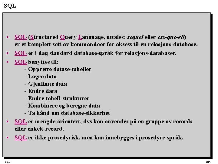 SQL • SQL (Structured Query Language, uttales: sequel eller ess-que-ell) er et komplett sett av kommandoer for aksess til en relasjons-database. • SQL er i dag standard database-språk for relasjons-databaser. • SQL benyttes til: - Opprette datase-tabeller - Lagre data - Gjenfinne data - Endre tabell-strukturer - Kombinere og beregne data - Ta hånd om database-sikkerhet • SQL er mengde-orientert, dvs kan anvendes på en gruppe av records eller enkelt-record. • SQL er ikke-prosedyrisk, men kan innebygges i prosedyre-språk. SQL Hi. A