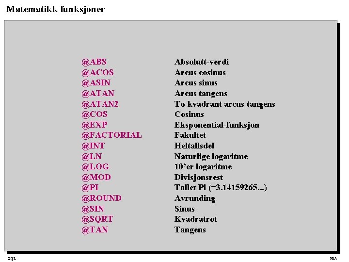 Matematikk funksjoner @ABS @ACOS @ASIN @ATAN 2 @COS @EXP @FACTORIAL @INT @LN @LOG @MOD @PI @ROUND @SIN @SQRT @TAN SQL Absolutt-verdi Arcus cosinus Arcus tangens To-kvadrant arcus tangens Cosinus Eksponential-funksjon Fakultet Heltallsdel Naturlige logaritme 10’er logaritme Divisjonsrest Tallet Pi (=3. 14159265. . . ) Avrunding Sinus Kvadratrot Tangens Hi. A