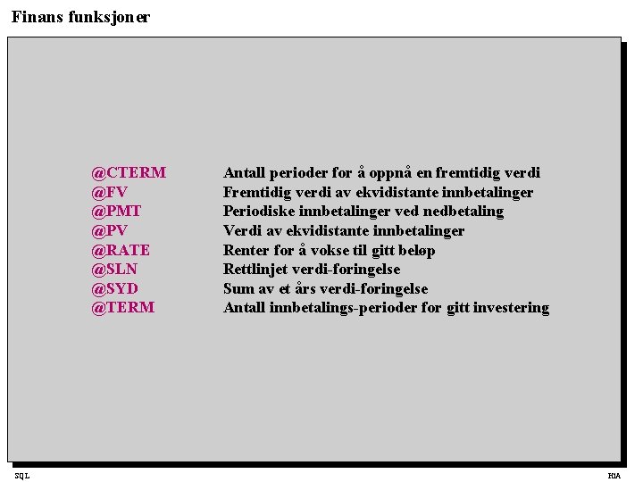 Finans funksjoner @CTERM @FV @PMT @PV @RATE @SLN @SYD @TERM SQL Antall perioder for å oppnå en fremtidig verdi Fremtidig verdi av ekvidistante innbetalinger Periodiske innbetalinger ved nedbetaling Verdi av ekvidistante innbetalinger Renter for å vokse til gitt beløp Rettlinjet verdi-foringelse Sum av et års verdi-foringelse Antall innbetalings-perioder for gitt investering Hi. A