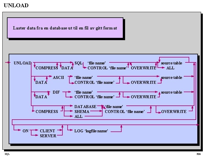 UNLOAD Laster data fra en database ut til en fil av gitt format UNLOAD SQL COMPRESS DATA ASCII DATA DIF DATA COMPRESS ON SQL CLIENT SERVER ‘file name’ CONTROL ‘file name’ OVERWRITE ‘file name’ CONTROL ‘file name’ DATABASE SHEMA ALL source table OVERWRITE ‘file name’ CONTROL ‘file name’ OVERWRITE LOG ‘logfile name’ Hi. A