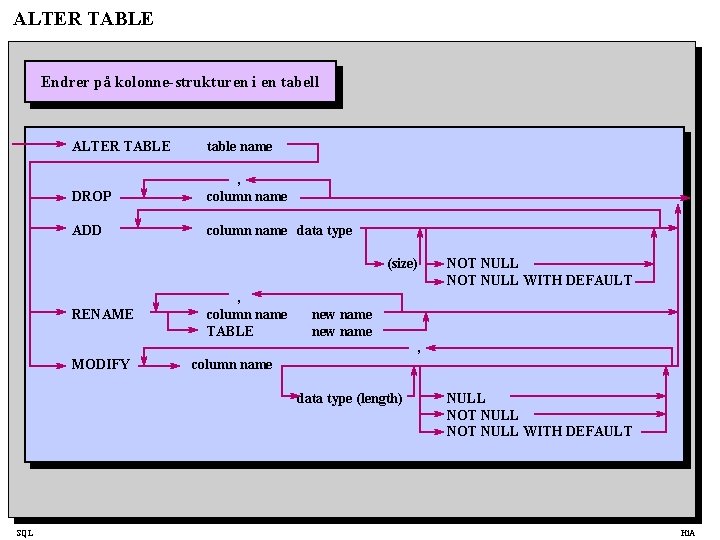 ALTER TABLE Endrer på kolonne-strukturen i en tabell ALTER TABLE table name DROP , column name ADD column name data type (size) RENAME , column name TABLE NOT NULL WITH DEFAULT new name , MODIFY column name data type (length) SQL NULL NOT NULL WITH DEFAULT Hi. A
