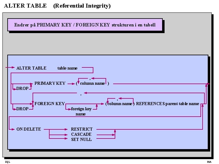 ALTER TABLE (Referential Integrity) Endrer på PRIMARY KEY / FOREIGN KEY strukturen i en tabell ALTER TABLE table name PRIMARY KEY , ( column name ) DROP , , ( column name ) REFERENCES parent table name FOREIGN KEY SQL DROP foreign key name ON DELETE RESTRICT CASCADE SET NULL Hi. A