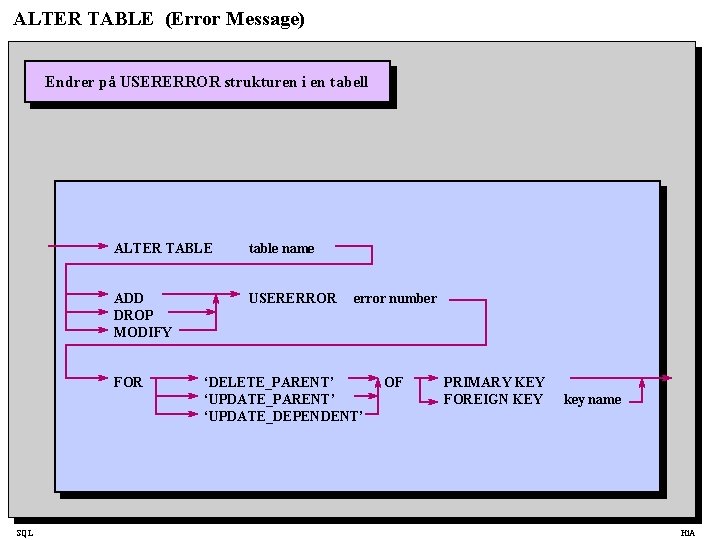 ALTER TABLE (Error Message) Endrer på USERERROR strukturen i en tabell ALTER TABLE table name ADD DROP MODIFY USERERROR FOR SQL error number ‘DELETE_PARENT’ ‘UPDATE_DEPENDENT’ OF PRIMARY KEY FOREIGN KEY key name Hi. A