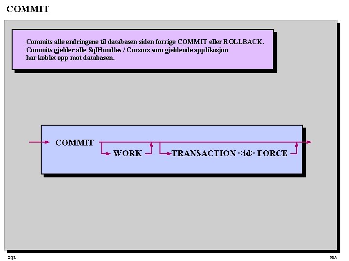 COMMIT Commits alle endringene til databasen siden forrige COMMIT eller ROLLBACK. Commits gjelder alle Sql. Handles / Cursors som gjeldende applikasjon har koblet opp mot databasen. COMMIT WORK SQL TRANSACTION <id> FORCE Hi. A