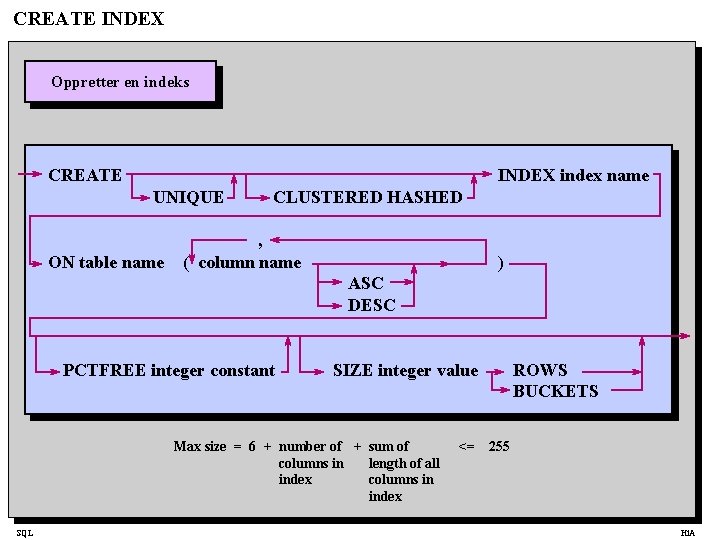 CREATE INDEX Oppretter en indeks CREATE INDEX index name UNIQUE ON table name CLUSTERED HASHED , ( column name ) ASC DESC PCTFREE integer constant SIZE integer value Max size = 6 + number of + sum of columns in length of all index columns in index SQL <= ROWS BUCKETS 255 Hi. A
