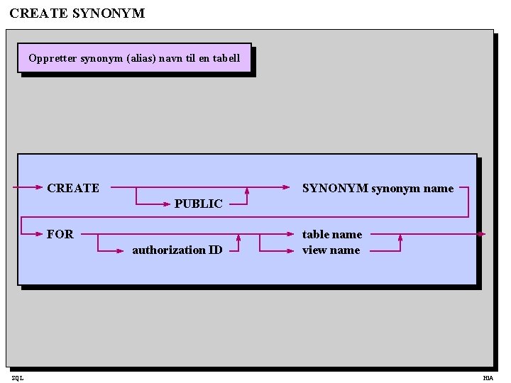 CREATE SYNONYM Oppretter synonym (alias) navn til en tabell CREATE SYNONYM synonym name PUBLIC FOR authorization ID SQL table name view name Hi. A