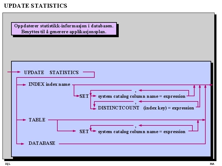 UPDATE STATISTICS Oppdaterer statistikk-informasjon i databasen. Benyttes til å generere applikasjonsplan. UPDATE STATISTICS INDEX index name SET , system catalog column name = expression , DISTINCTCOUNT (index key) = expression TABLE SET , system catalog column name = expression DATABASE SQL Hi. A