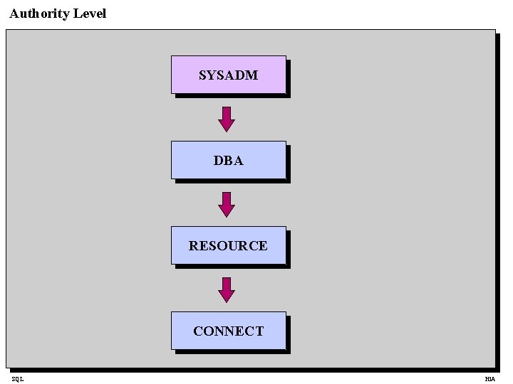 Authority Level SYSADM DBA RESOURCE CONNECT SQL Hi. A