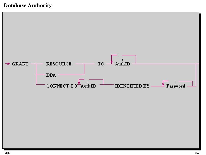 Database Authority GRANT RESOURCE TO , Auth. ID DBA , CONNECT TO Auth. ID SQL IDENTIFIED BY , Password Hi. A