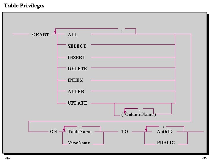 Table Privileges , GRANT ALL SELECT INSERT DELETE INDEX ALTER UPDATE , ( Column. Name ) ON , Table. Name View. Name SQL TO , Auth. ID PUBLIC Hi. A