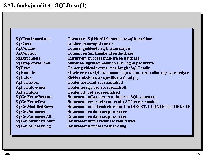 SAL funksjonalitet i SQLBase (1) Sql. Clear. Immediate Sql. Close Sql. Commit Sql. Connect Sql. Disconnect Sql. Drop. Stored. Cmd Sql. Error Sql. Execute Sql. Exists Sql. Fetch. Next Sql. Fetch. Previous Sql. Fetch. Row Sql. Get. Error. Position Sql. Get. Error. Text Sql. Get. Modified. Rows Sql. Get. Parameter. All Sql. Get. Result. Set. Count Sql. Get. Rollback. Flag SQL Disconnect Sql Handle benyttet av Sql. Immediate Lukker en navngitt cursor Commit gjeldende SQL transaksjon Connect en Sql Handle til en database Disconnect en Sql Handle fra en database Sletter en lagret kommando eller lagret prosedyre Henter gjeldende error kode for gitt Sql Handle Eksekverer et SQL statement, lagret kommendo eller lagret prosedyre Sjekker eksistens av spesifisert(e) rad(er) Henter neste rad i et resultatsett Henter forrige rad i et resultatsett Henter gitt rad i et resultatsett Returnerer offset i en error innen et SQL statement Returnerer error-tekst for et gitt SQL error number Returnerer antall endrete rader i en INSERT, UPDATE eller DELETE Returnerer en databaseparameter Returnerer antall rader i et resultatsett Returnerer database rollback flag Hi. A