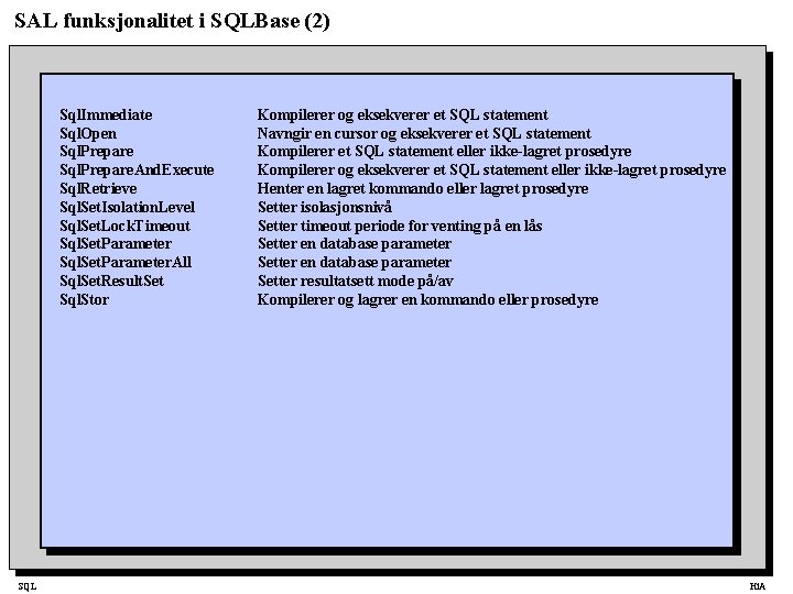 SAL funksjonalitet i SQLBase (2) Sql. Immediate Sql. Open Sql. Prepare. And. Execute Sql. Retrieve Sql. Set. Isolation. Level Sql. Set. Lock. Timeout Sql. Set. Parameter. All Sql. Set. Result. Set Sql. Stor SQL Kompilerer og eksekverer et SQL statement Navngir en cursor og eksekverer et SQL statement Kompilerer et SQL statement eller ikke-lagret prosedyre Kompilerer og eksekverer et SQL statement eller ikke-lagret prosedyre Henter en lagret kommando eller lagret prosedyre Setter isolasjonsnivå Setter timeout periode for venting på en lås Setter en database parameter Setter resultatsett mode på/av Kompilerer og lagrer en kommando eller prosedyre Hi. A