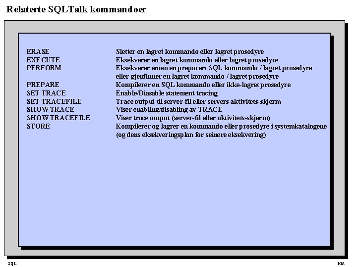 Relaterte SQLTalk kommandoer ERASE EXECUTE PERFORM PREPARE SET TRACEFILE SHOW TRACEFILE STORE SQL Sletter en lagret kommando eller lagret prosedyre Eksekverer enten en preparert SQL kommando / lagret prosedyre eller gjenfinner en lagret kommando / lagret prosedyre Kompilerer en SQL kommando eller ikke-lagret prosedyre Enable/Diasable statement tracing Trace output til server-fil eller servers aktivitets-skjerm Viser enabling/disabling av TRACE Viser trace output (server-fil eller aktivitets-skjerm) Kompilerer og lagrer en kommando eller prosedyre i systemkatalogene (og dens eksekveringsplan for seinere eksekvering) Hi. A