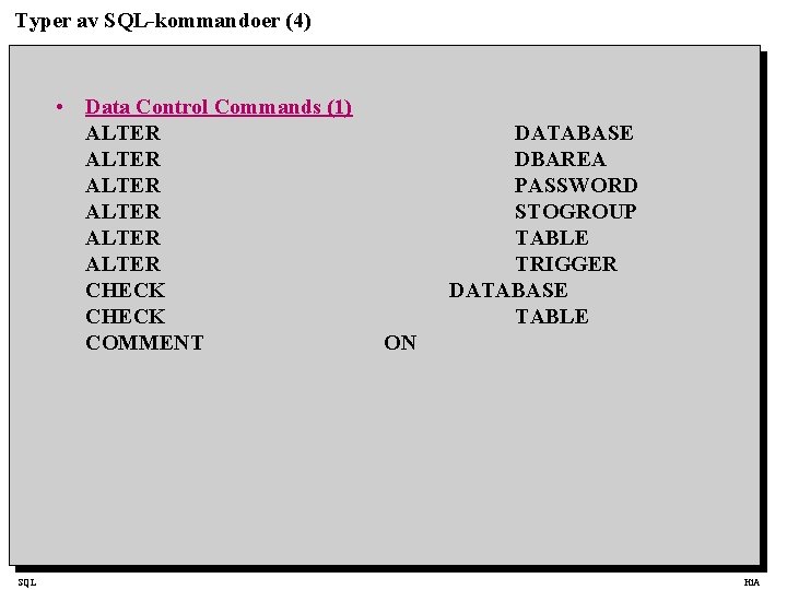 Typer av SQL-kommandoer (4) • Data Control Commands (1) ALTER ALTER CHECK COMMENT SQL DATABASE DBAREA PASSWORD STOGROUP TABLE TRIGGER DATABASE TABLE ON Hi. A