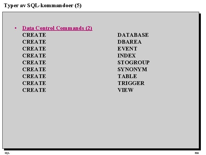 Typer av SQL-kommandoer (5) • Data Control Commands (2) CREATE CREATE CREATE SQL DATABASE DBAREA EVENT INDEX STOGROUP SYNONYM TABLE TRIGGER VIEW Hi. A